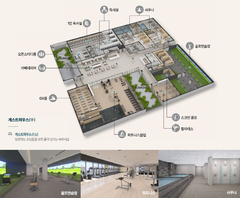 ❶ 피트니스클럽 ❷ 골프연습장 ❸ GX룸 ❹ 사우나 ❺ 독서실/스터디룸 ❻ 카페테리아
